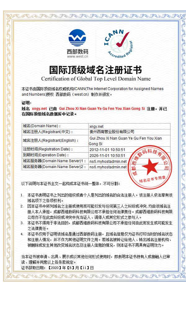 | 權屬證明 | 證書(shū)由國際頂級域名權威機構ICANN(The InternetCorporationforAssignedNamesandNumbers)授權 西部數碼(westcn)制作并頒發(fā)。 | |||||||