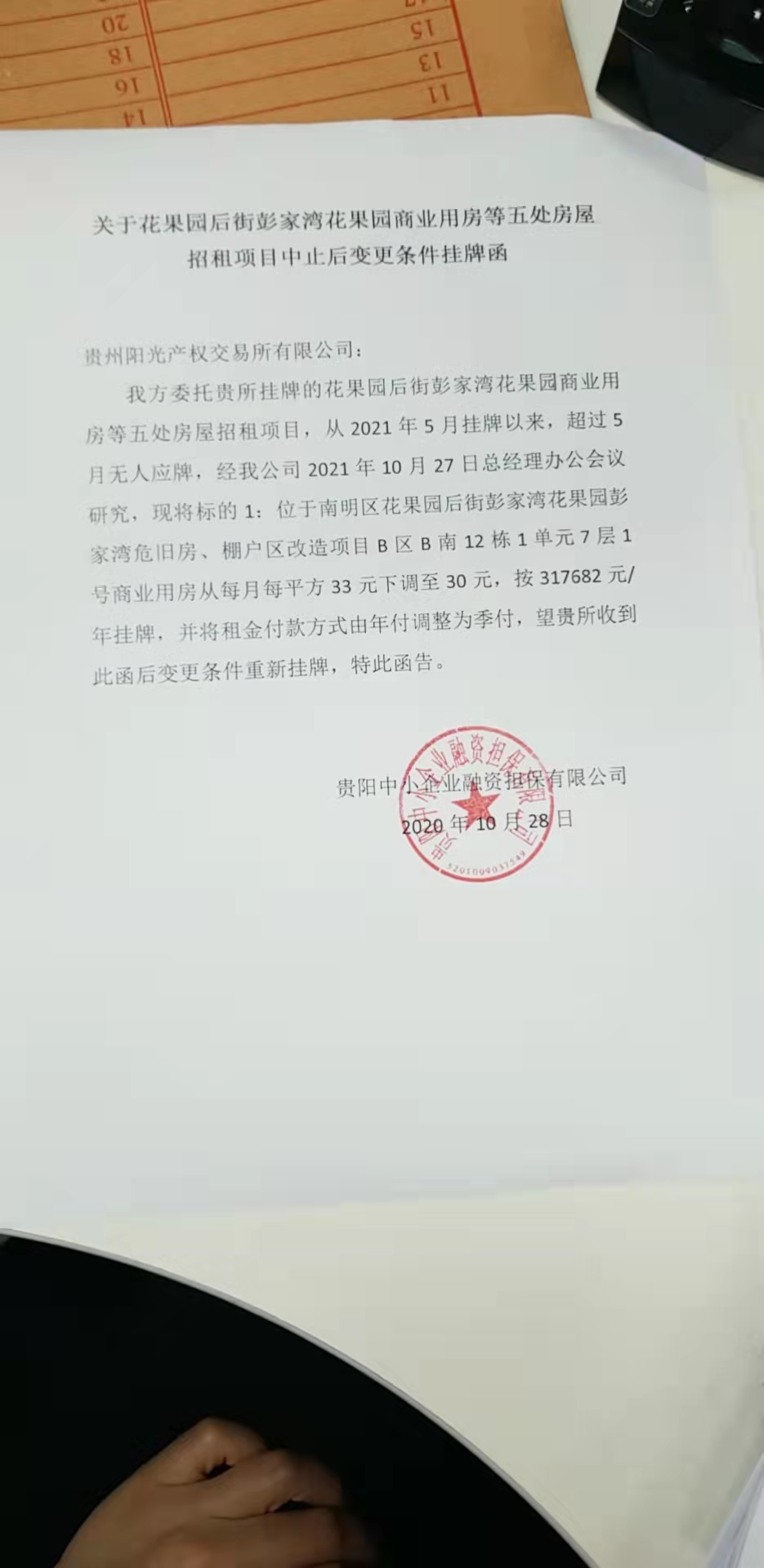 我所受貴陽(yáng)中小企業(yè)融資擔保有限公司委托掛牌《花果園后街彭家灣花果園商業(yè)用房等五處房屋招租項目》項目編號GP-C-ZL-2021033(32),因招租方要求需對項目進(jìn)行條件變更,現將項目進(jìn)行中止掛牌。