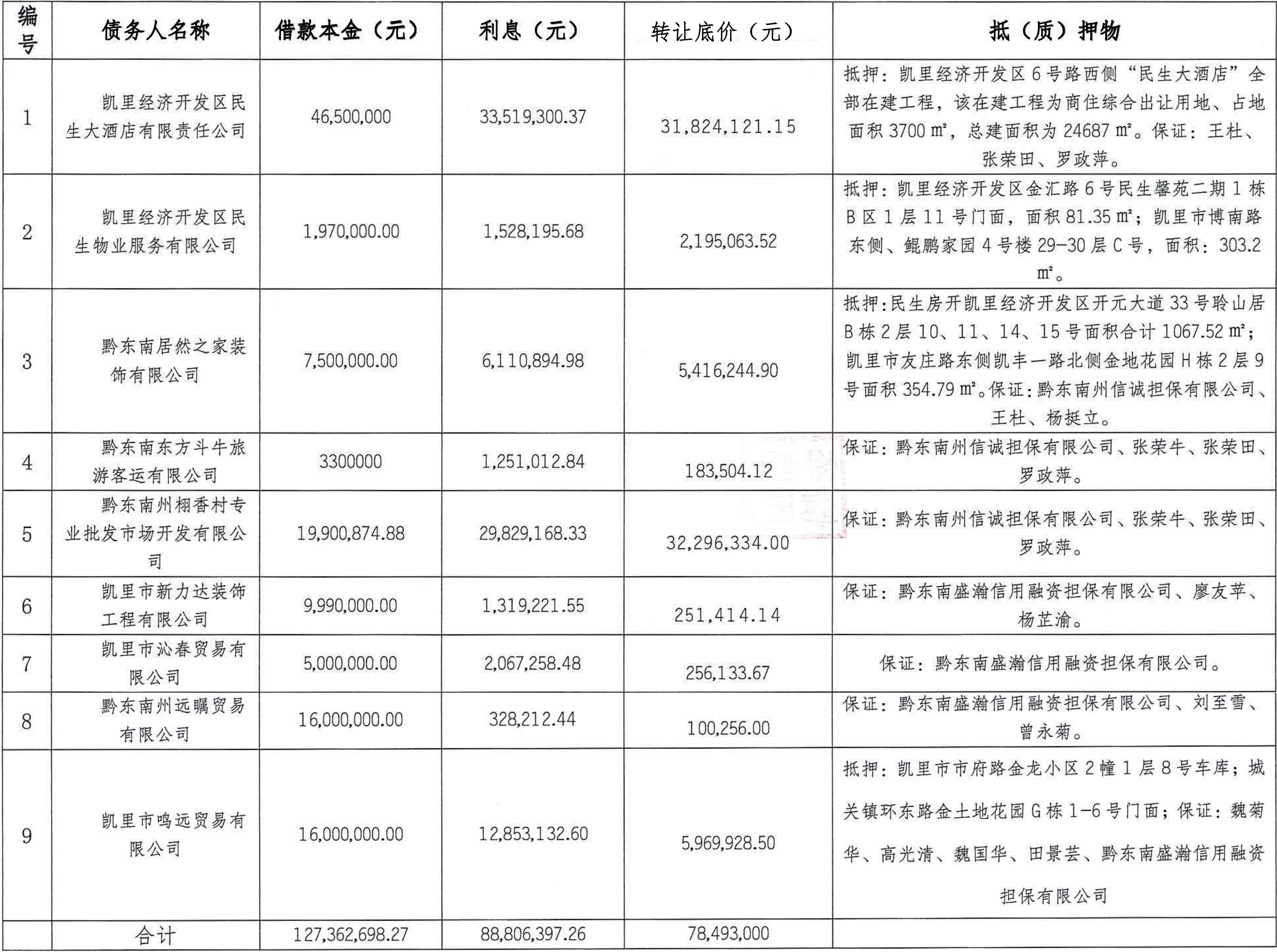 凱里經(jīng)濟開(kāi)發(fā)區民生大酒店有限責任公司等 9 戶(hù)債權資產(chǎn)包整體轉讓